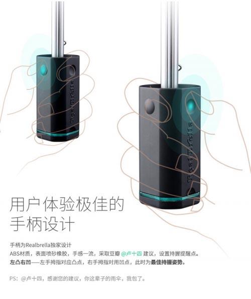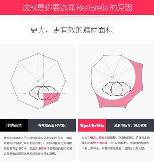 RealBrella不会淋湿肩膀的雨伞,来自新锐设计师的全新作品。不规则的伞面,可以解决传统圆形雨伞的造型造成人们肩膀和后背被雨淋湿的痛点;更高的伞骨强度,更好防晒功能;专利手柄设计,增加了LED照明功能。这个雨季,让你与众不同。折叠后只有30cm长,便携再也不是问题;多彩可选;伞内三层黑胶涂层,防晒系数50+;伞面纳米...