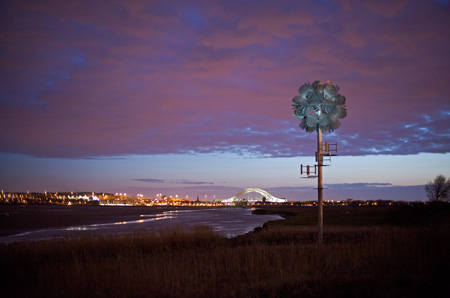 这款名为“未来花”的雕塑是由英国设计师在墨西河边建造的。它是一朵高达14米的金属花。花瓣是用穿孔镀锌钢板制成的,花朵中间装有LED灯,并配备小型风力发电机为其供电。在夜间,这朵花会发出光亮,装点着威德尼斯的夜空。我们还曾为您介绍过该设计师的巨型风琴,恰巧也是一座和“风”有关的雕塑。