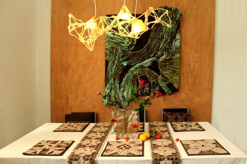 这些软装饰作品是由西南交通大学纤维艺术设计研究中心的设计者们经历了概念设计、材料选取、单体制作、成品制作等阶段,花了四个月的时间纯手工精心制作而成的。成品都是设计者们先了解了扎染与面料再造国内外的发展现状,结合了传统与现代的因素,在查阅相关的资料后,确定在居室空间中需要制作的物品,选择卧室或餐厅作为设...
