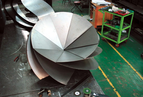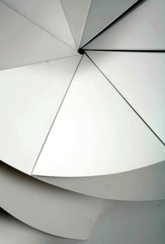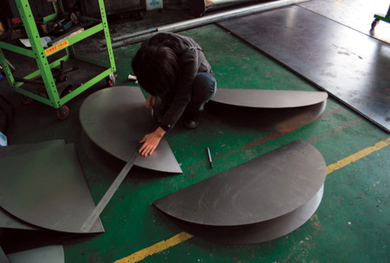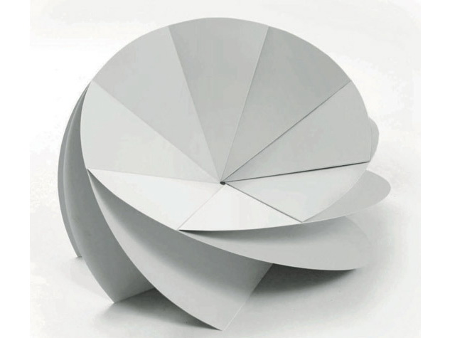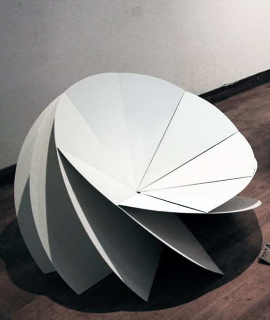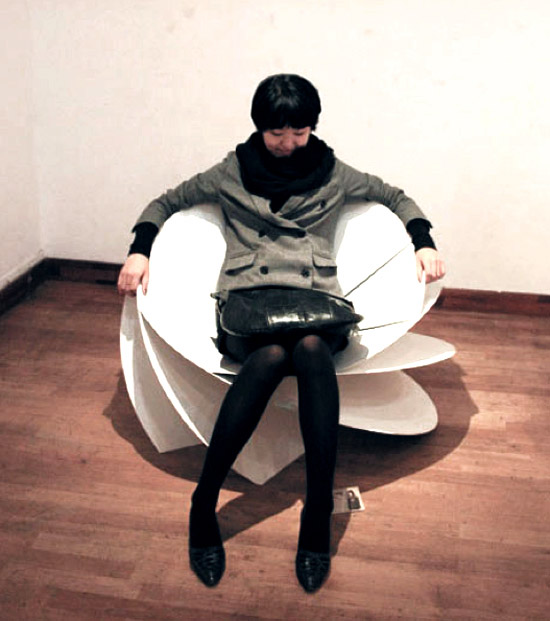 花椅是由韩国设计师Eerang Park设计,花椅由8 块折叠钢板组成。每块钢板都围绕一个中心点安装,形成扇形。钢板和钢板之间夹角为35 度,看起来每块钢板都叠在另一块钢板之上。各个钢板作用各异,用的是椅腿,有的是椅背,有的是椅面,有的是椅子扶手。