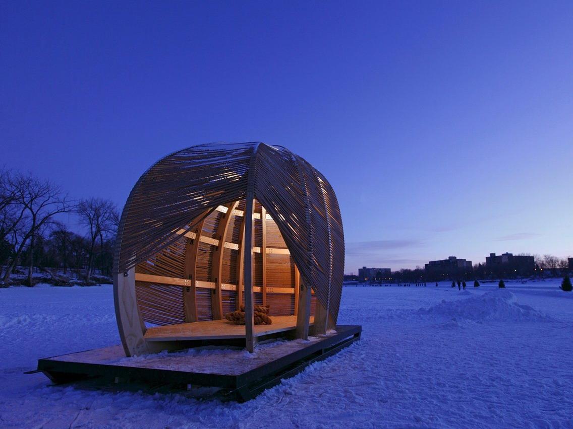 设计师:Frank Gehry, Patricia Patkau和Antoine Predock图片提供:Kevin Erickson温尼伯市的阿西尼玻河是世界上最长的自然封冻滑冰道,每年有超过400万的游客前来游玩。沿着滑冰道每一千米就有一个暖房供游人取暖。这个绳索编织形成的结构是2012年暖房设计竞赛的获奖者,是一个融合了艺术和建筑元素的亭子。这个暖房用材简...
