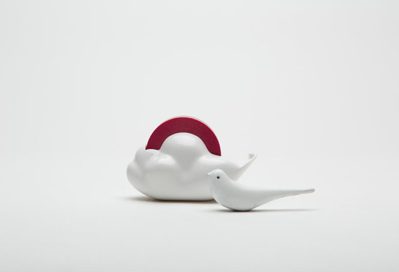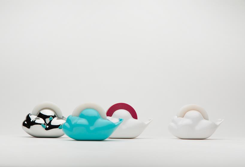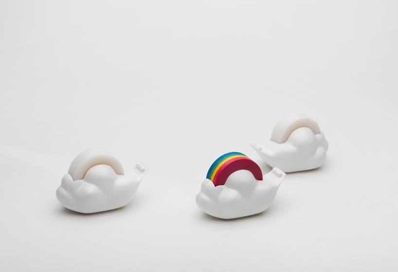 韩国设计事务所studio gongdreen设计的“快乐的云形胶带座”让使用者在繁忙的都市或办公室空间中还可以与大自然有所联系。这种胶带座采用白云的形状,内置胶带被设计成色彩缤纷的彩虹,使用的时候彩虹胶带就在白云上转动。这个设计使用可循环ABS塑料制作的,有白色、天蓝色和镀铬三种选择。